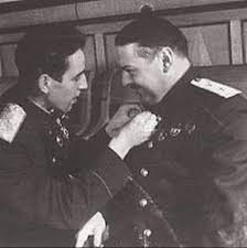Другий секретар Ленінградського обкому ВКП(б) Олексій Кузнецов вручає Андрію Ждавнову медаль "За оборону Ленінграда"